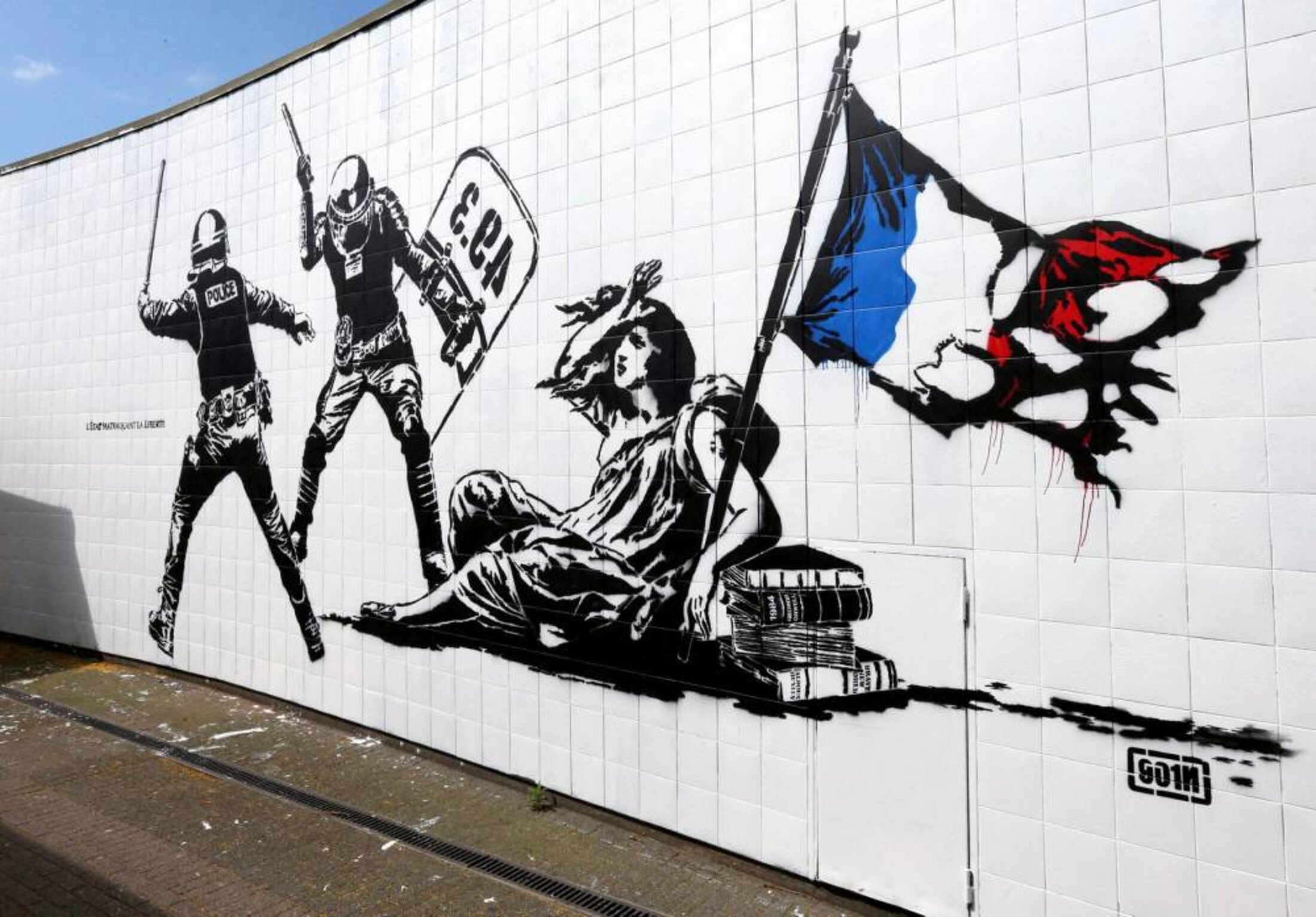 L’État matraquant la liberté, peinture murale de Goin, réalisee dans le cadre du Street Art Festival, Grenoble (2026), puis détruite car jugée "antipolice".